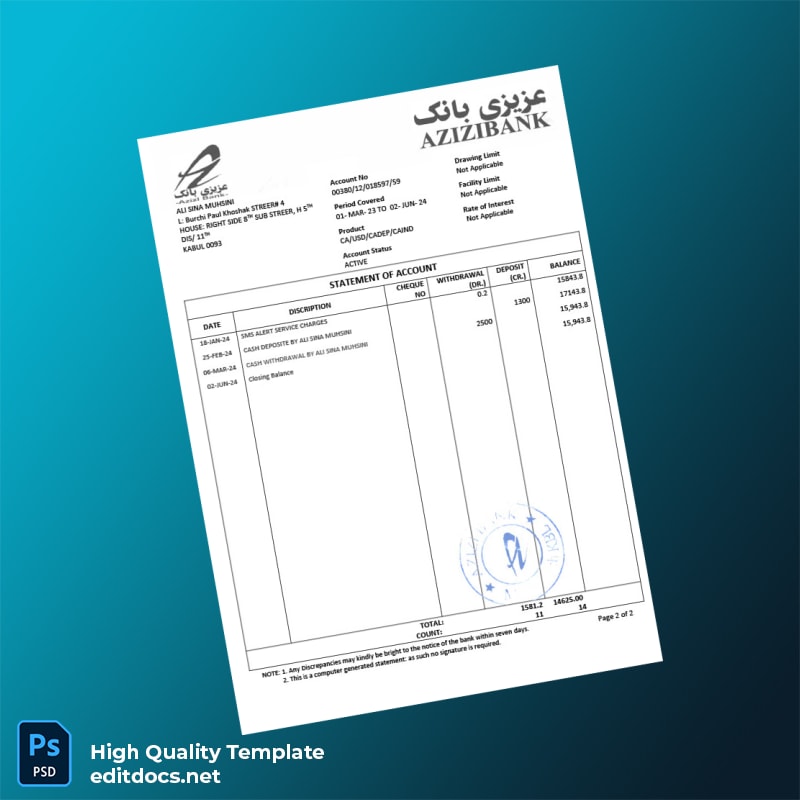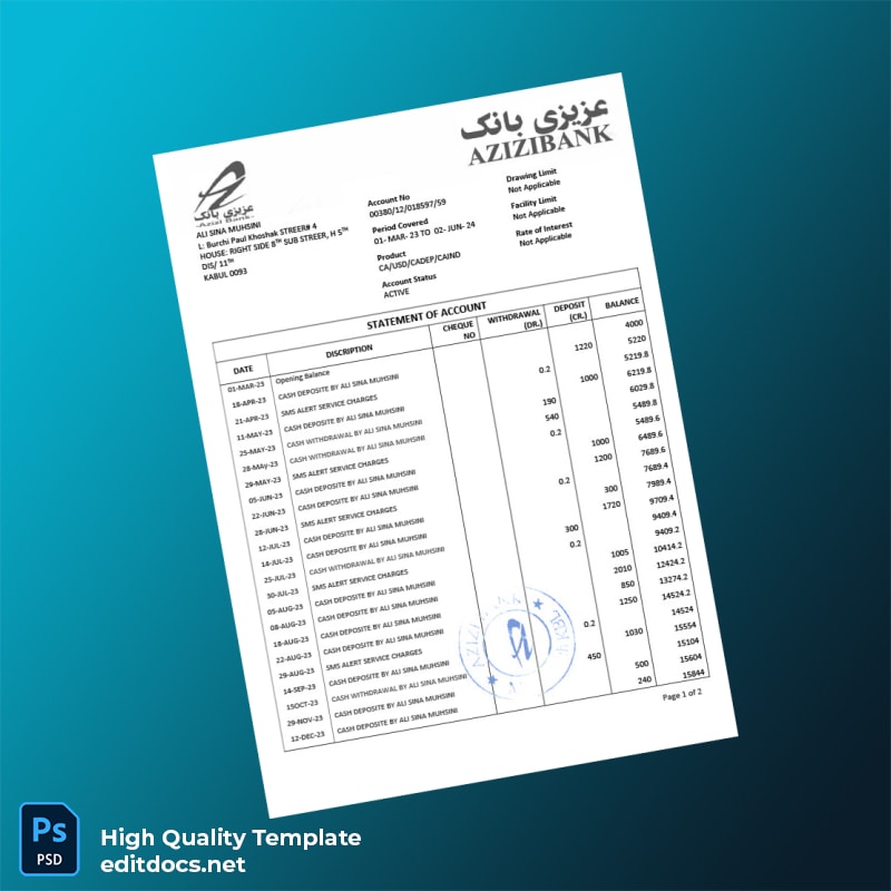 If you’re in urgent need of an official bank statement but find yourself without the right documents, you’re not alone. Many professionals face the challenge of losing essential financial statements, whether due to theft, accidental loss, or simply the expiration of documents. Fortunately, our Afghanistan Azizi Bank Statement Template is designed to provide you with an efficient and reliable solution.