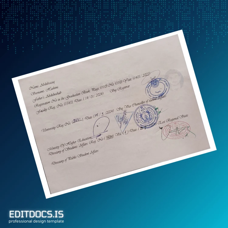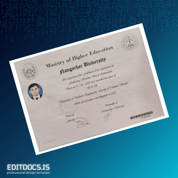 This editable diploma template offers a professional, customizable solution to recreate the Afghanistan Nangarhar University Bachelor’s Degree in Software Engineering with ease. Designed for individuals who need a quick and accurate replacement diploma or a backup, this digital template ensures seamless editing and high-quality output.