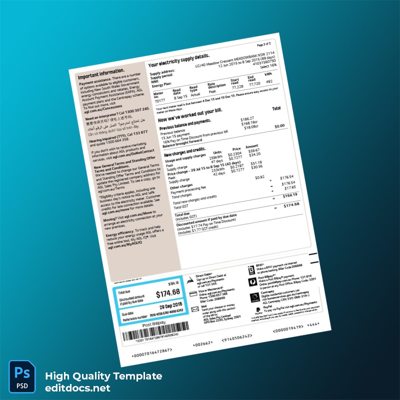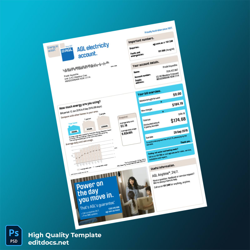Australia AGL Sales Pty Limited Editable Energy Bill Template Overview