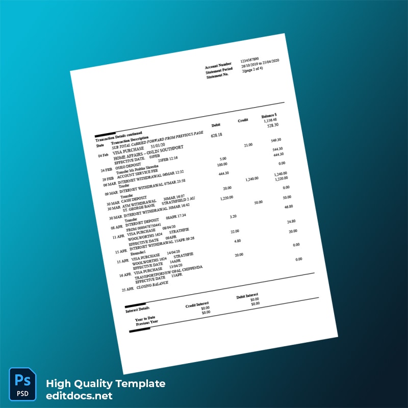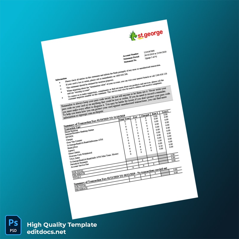 Introducing the Australia St George Bank Statement Template, a meticulously crafted document available in both Word and PDF formats, designed to meet the essential needs of professionals seeking high-quality editable bank statements. Whether you require a three-month or six-month statement, this template guarantees a quick and efficient solution.