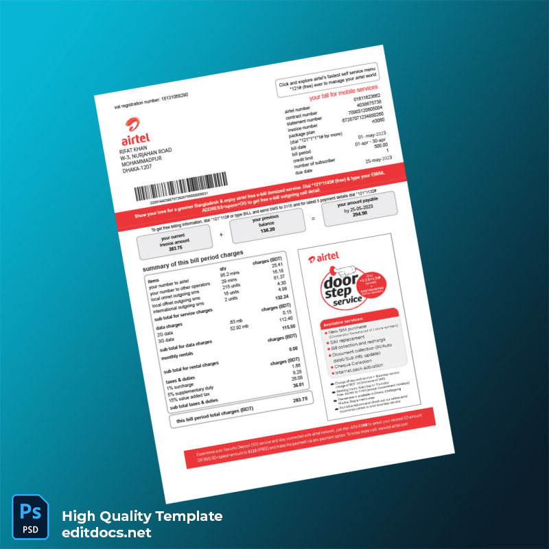 Editable Utility Bill Template Tailored for Bangladesh Airtel