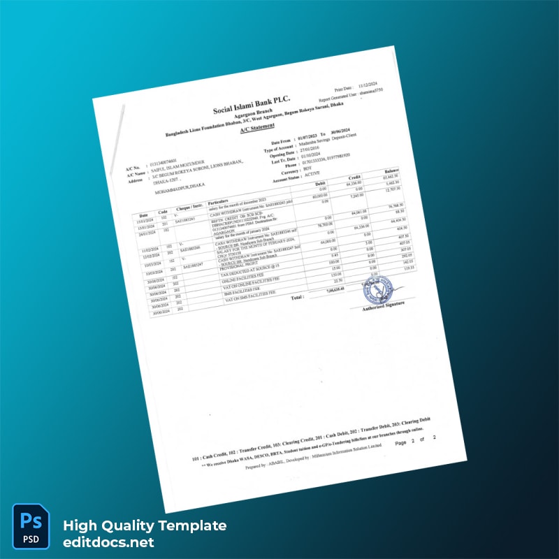 Bangladesh SIBL Bank Statement Template in Word and PDF formats 2 page