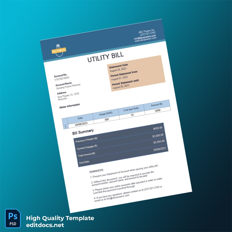 Be the first to review “Belgium ABC Powers Editable Utility Bill Template in Word and PDF formats”