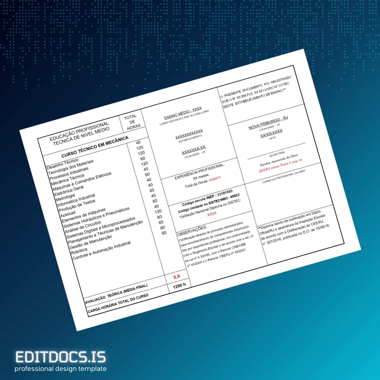 Our editable diploma template offers a fast, professional solution for recreating your Brazil Centro de Qualificação Técnica Technical High School Diploma in Mechanics. Designed for easy customization, this digital diploma download ensures that students, alumni, and professionals can quickly generate a high-quality replacement diploma using common tools like Microsoft Word and PDF editors. Perfect for those who need a blank diploma form or a customizable degree template, this resource streamlines the process with a thoughtful design optimized for clarity and official appearance.