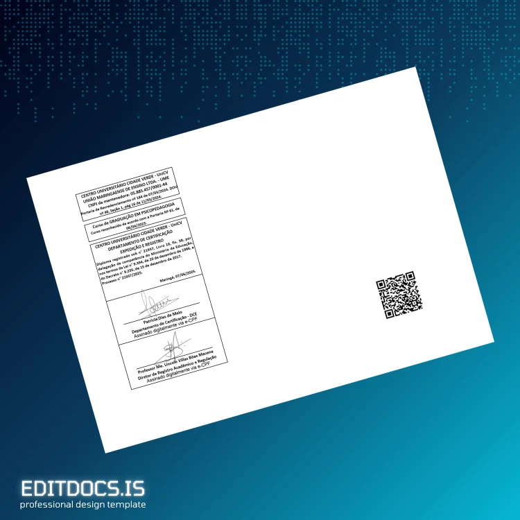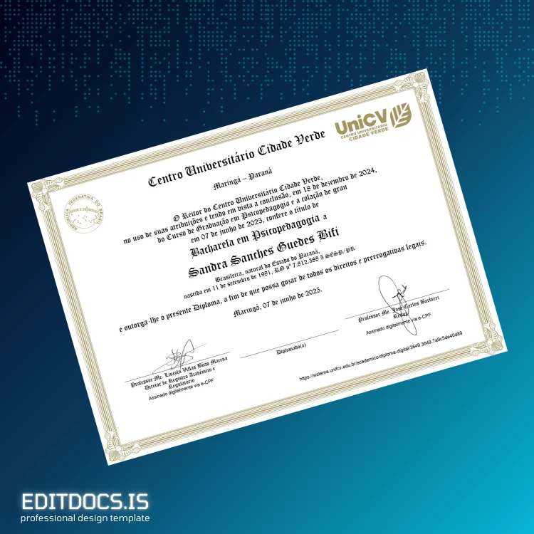 This editable diploma template allows you to quickly generate a professional and customizable Bachelor of Arts in Psychopedagogy certificate from Brazil Centro Universitário Cidade Verde. Designed for ease of use, it provides a high-quality digital diploma download format in both Word and PDF, enabling seamless editing and printing for replacement or backup purposes.