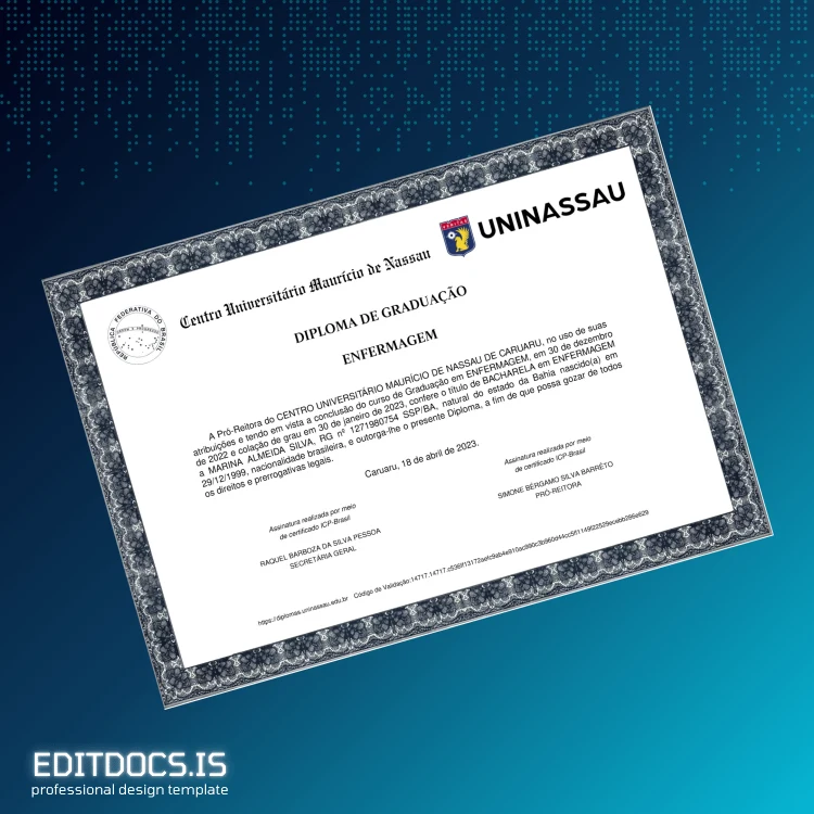 Effortlessly restore your academic credentials with this fully editable Brazil Centro Universitário Maurício de Nassau Bachelor of Nursing Degree Template, available in both Word and PDF formats. Designed for professionals seeking an authentic yet customizable replacement or backup, this template offers a seamless way to produce a high-quality diploma that mirrors official documentation. Ideal for users who need to reproduce or revive their Bachelor of Nursing degree without compromise, this digital diploma download stands out in the editable diploma template market.