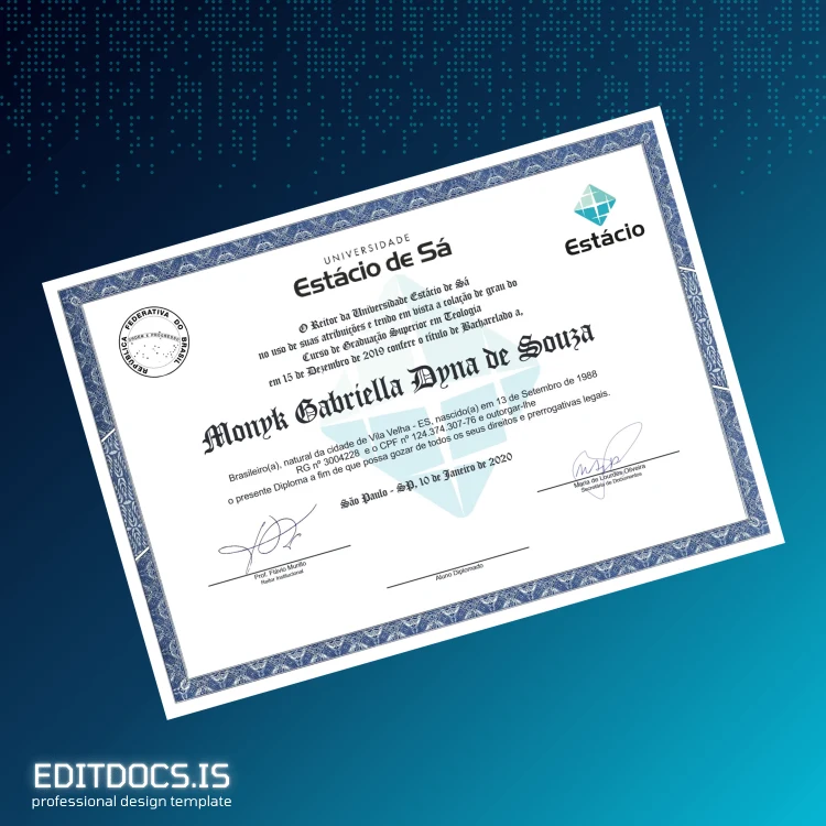 This editable diploma template offers an efficient way to recreate a professional Bachelor of Theology certificate from Brazil Estácio de Sá University. Perfect for professionals needing a replacement diploma quickly or creating novelty diploma designs for personal use, this customizable degree template supports both Word and PDF formats for seamless editing and high-quality output. Designed with ease of use in mind, it simplifies the process of producing a polished, digital diploma download.