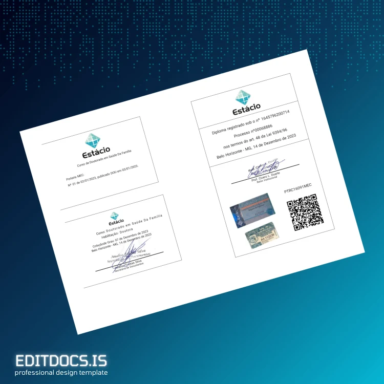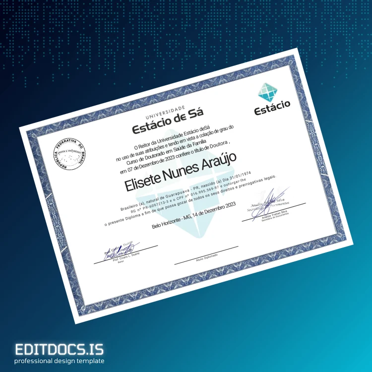 Create a professional and authentic-looking Brazil Estácio University Doctorate in Family Health Degree easily with this versatile digital template. Designed for quick customization, this template comes in both Word and PDF formats, providing a seamless experience for professionals who need a reliable and editable diploma form. Whether you are looking to restore a lost document or need a replacement diploma, this editable diploma template ensures a polished, ready-to-print result tailored to your needs.