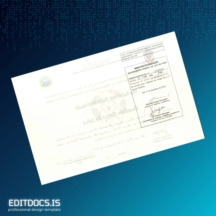 This customizable degree template offers a professional and editable digital diploma download, allowing you to easily replace lost or damaged documents. Designed specifically for graduates of the Brazil Federal University of Juiz de Fora, this blank diploma form ensures authenticity and style. Access our editable diploma template category for more versatile certificate designs tailored for academic and professional needs.