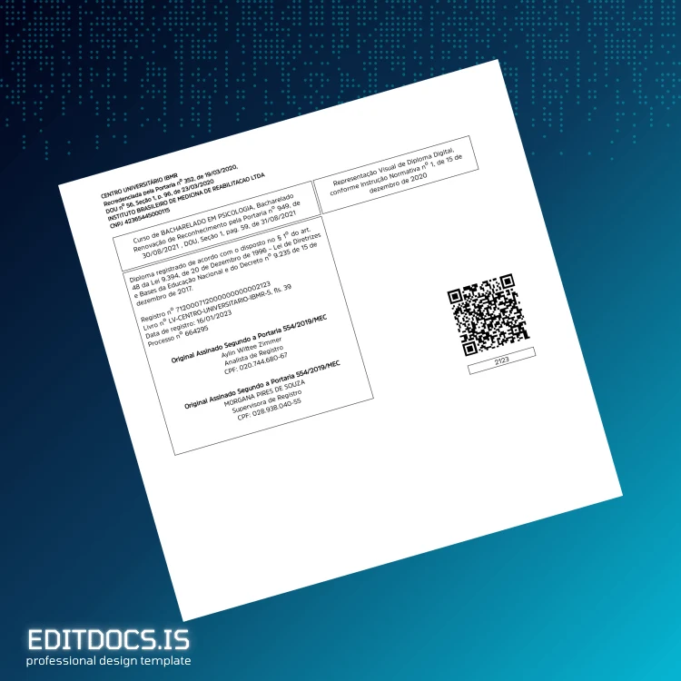This editable diploma certificate template is designed to help you quickly and effortlessly replace or customize your academic credential. Perfect for those seeking a professional, digital version of the Brazil IBMR University Center Bachelor of Science in Psychology degree, this Word and PDF format template allows seamless personalization to fit your individual details. Whether you need a backup copy, a replacement diploma, or a novelty design, this digital download makes editing straightforward and reliable.