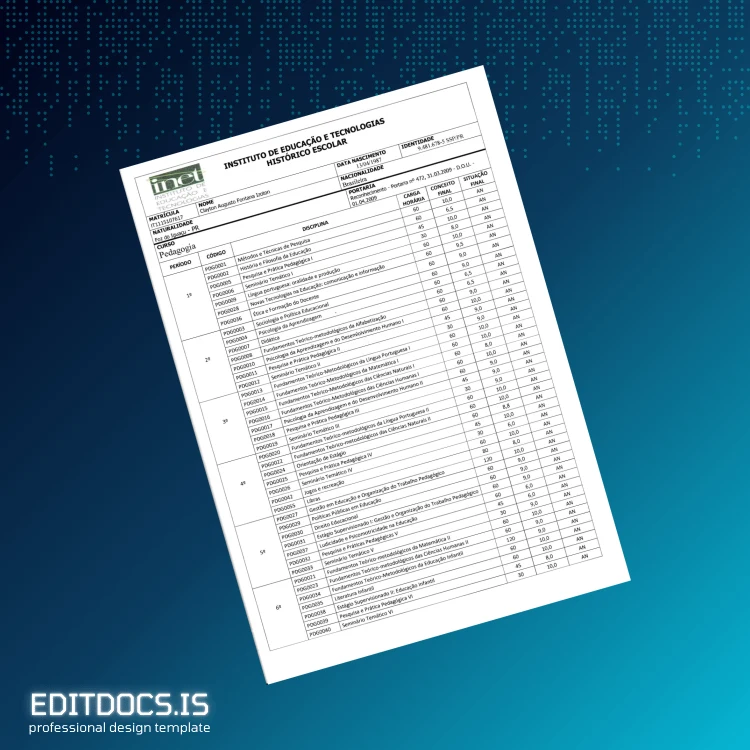 Quickly generate a professional, editable diploma using this comprehensive template designed specifically for the Brazil Instituto de Educação e Tecnologias Diploma in Pedagogy. Perfect for anyone needing a customizable diploma form, this digital file enables easy correction and updating of academic credentials with a professional finish.