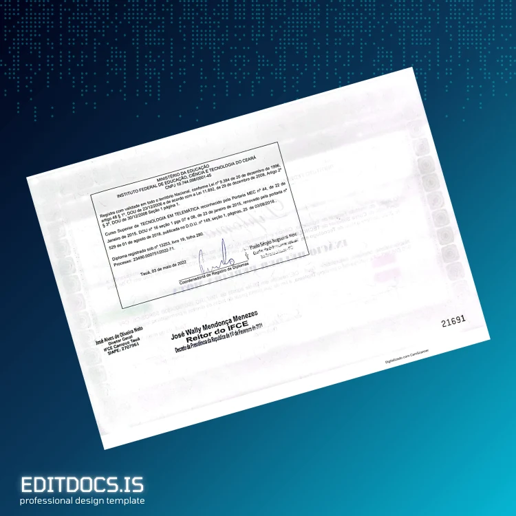 Effortlessly restore or create a professional diploma with our editable template designed specifically for the Brazil Instituto Federal de Educação, Ciência e Tecnologia do Ceará technology diploma. This digital download includes both Word and PDF formats, enabling seamless customization and easy printing for official or personal purposes. Perfect for professionals needing a replacement diploma or a high-quality novelty diploma design, it offers an ideal solution for quick, reliable diploma generation.