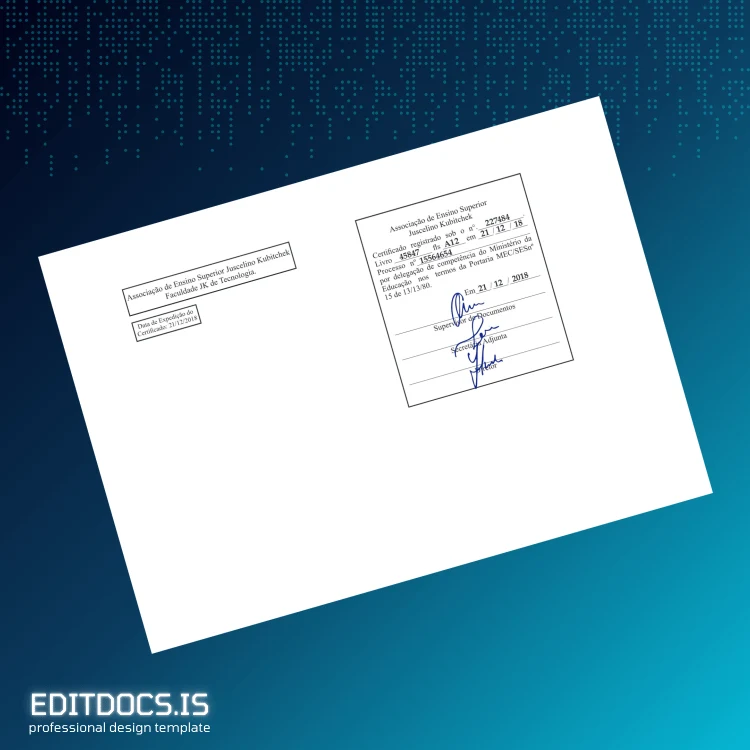 This editable diploma template offers a quick and professional way to produce a Brazil JK de Tecnologia Bachelor of Science in Information Systems certificate in both Word and PDF formats. Ideal for professionals who require a customizable degree template that ensures high-quality output and ease of use, this digital diploma download enables users to efficiently generate replacement diplomas or novelty diploma designs tailored to their specific needs. Experience seamless editing and instant access with this blank diploma form, suited for various applications such as academic record recovery or certificate replication.