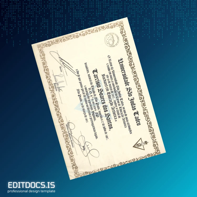The Brazil Tarcisio University Diploma Template (Word & PDF) is a professional, customizable digital document designed for easy and fast replacement or personal use. This editable diploma certificate template allows you to craft a polished, high-quality diploma that suits your needs perfectly. Whether you need a backup for your original degree, a replacement copy, or a novelty diploma design, this template provides the flexibility to modify every detail with ease.