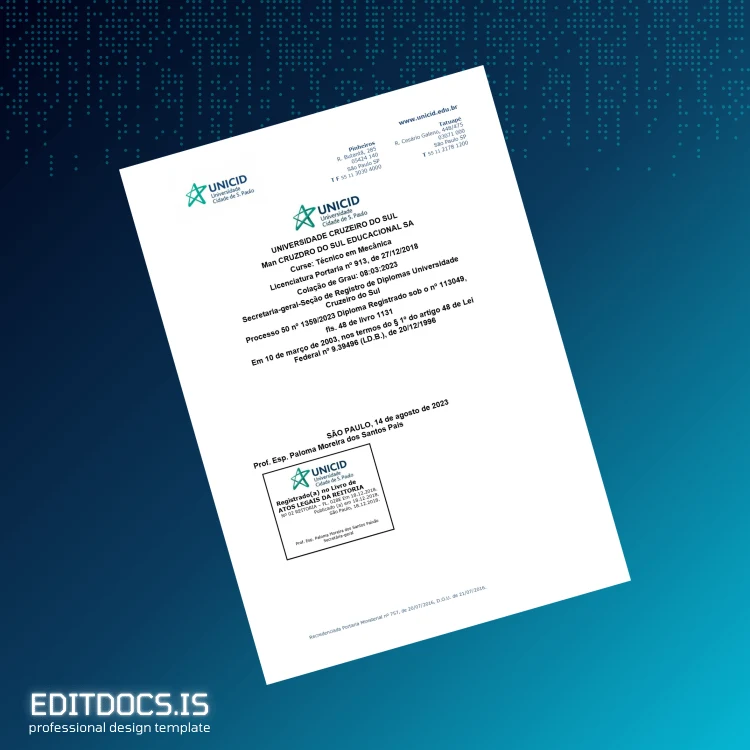 This digital diploma template offers a professional and editable solution for those needing a replacement or backup copy of their Brazil Universidade Cruzeiro do Sul Technical Degree in Mechanics. Designed in both Word and PDF formats, this template allows swift customization to suit your individual details, ensuring a perfect, ready-to-print certificate in no time. Whether you’ve misplaced your original diploma or require a pristine professional-looking document, this template simplifies the entire process.
