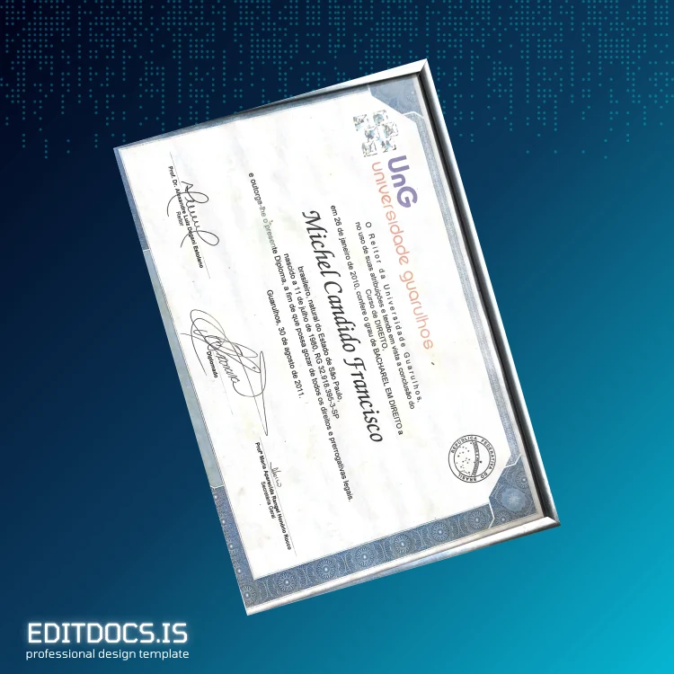 This editable diploma template provides a professional and customizable degree certificate for the Brazil Universidade de Guarulhos Bachelor of Laws program. Designed for legal professionals seeking a seamless way to produce official-looking documents, this template is perfect for creating replacement copies, novelty designs, or archival backups with ease. The digital diploma download includes high-quality Word and PDF formats, enabling quick editing and printing to suit your exact needs.