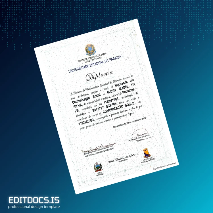This versatile digital diploma template offers a convenient and professional way to produce a customized Bachelor of Social Communication certificate from Brazil’s Universidade Estadual da Paraíba. Perfect for individuals needing a replacement diploma or for creative professionals designing official documents, this editable Word and PDF file provides seamless customization options and instant download access.