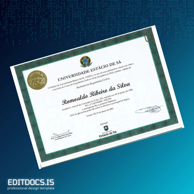 This professional, editable diploma template allows you to effortlessly customize and produce a high-quality replica of the Brazil Universidade Estadual de Sá Bachelor of Civil Engineering certificate. Available in both Word and PDF formats, this digital diploma download is designed for easy editing and swift delivery, providing an ideal solution for those needing a replacement diploma or a backup copy in a professional, customizable format. Crafted to match official design standards, it ensures a polished and authentic appearance.