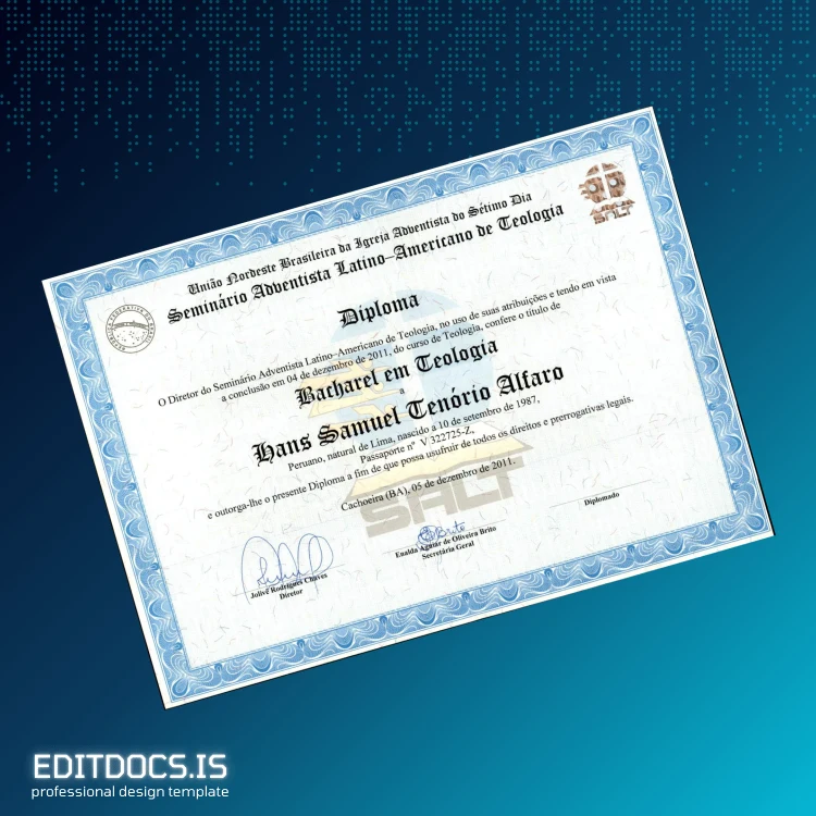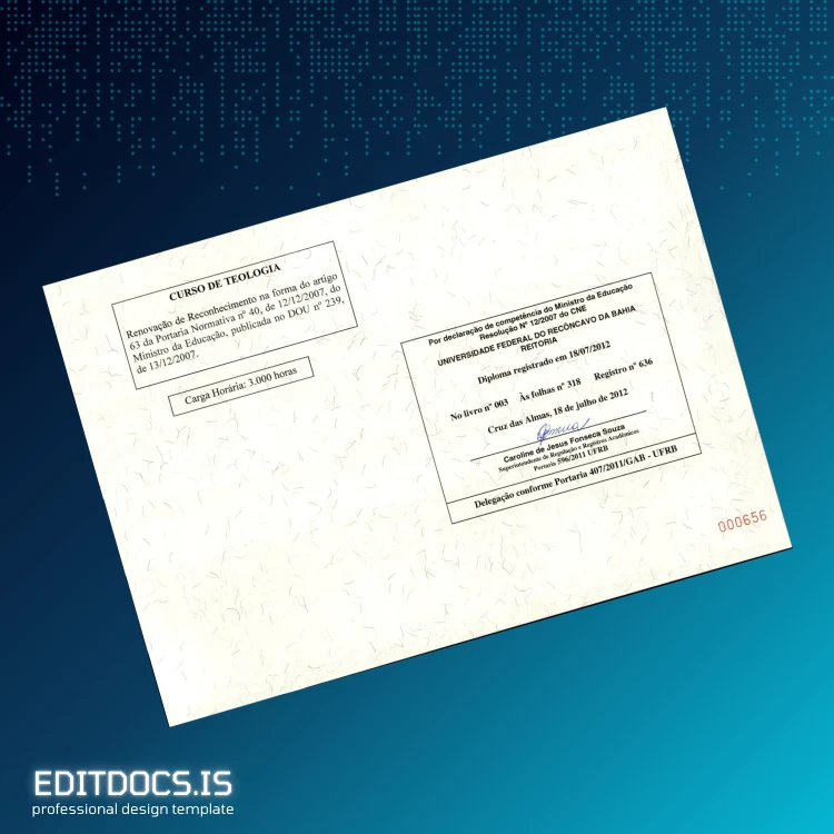 This editable diploma template provides a professional and high-quality solution to recreate or replace your Bachelor of Theology certificate from Brazil Universidade Federal do Recôncavo da Bahia. Designed for easy customization, this downloadable digital file allows you to swiftly edit all vital details and produce a polished diploma suitable for personal use or verification purposes.