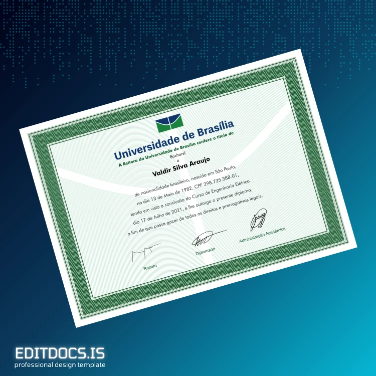 This editable diploma template offers a professional and customizable solution for individuals seeking a high-quality Brazil University of Brasília Bachelor of Science in Electrical Engineering degree certificate. Available in Word and PDF formats, this digital diploma download allows quick and easy modification of essential details, providing a seamless replacement diploma template for lost or damaged documents. Perfect for those needing a blank diploma form to efficiently recreate their academic credentials with precision and style.