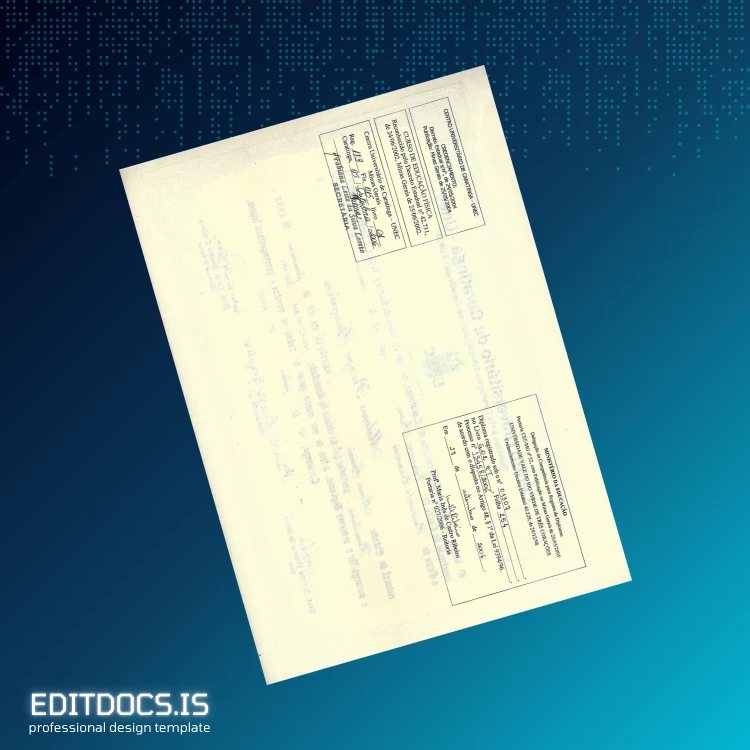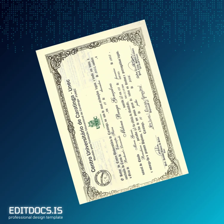 This editable diploma template offers a convenient and professional solution for restoring or personalizing your Brazil University of Caratinga Bachelor of Education certificate. Designed for seamless customization, this digital diploma download provides a high-quality and fully editable Word and PDF file perfect for those who need a replacement diploma template or a novelty diploma design. Whether you require a blank diploma form for academic use or desire a customizable degree template for personal projects, this file provides the ultimate flexibility and professional appearance. Explore more options within our editable diploma template category.