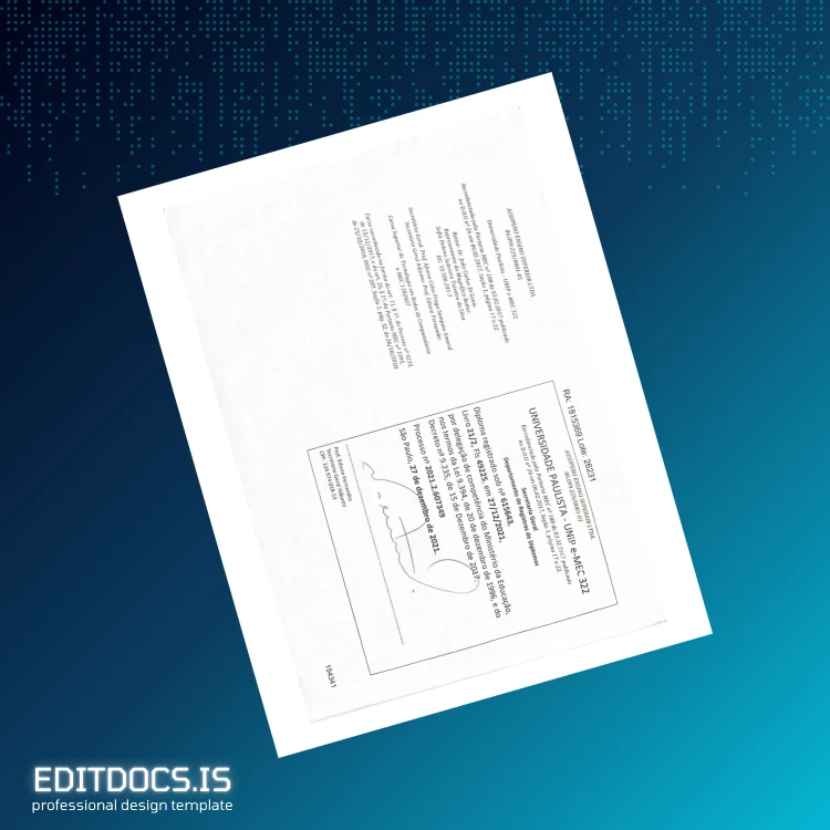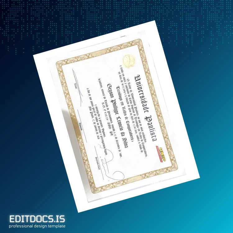 Discover a professional, editable diploma template designed for speedy customization and flawless presentation. This digital download features the Brazil University of Paulista Technology Degree in Computer Networks in editable Word and PDF formats, ideal for anyone seeking a high-quality replacement diploma or a customizable degree document for personal use. Perfect for those needing a quick, reliable alternative, this template supports easy text adjustments, layout edits, and personalized details, making it a versatile choice among editable diploma template solutions.