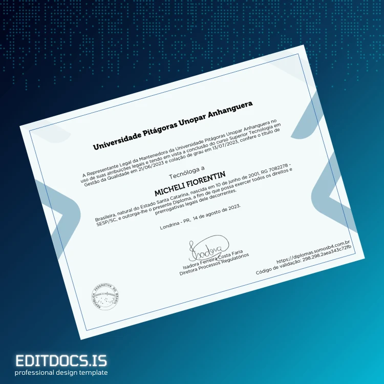 This editable diploma template offers a professional and customizable solution for recreating your Brazil University Pitágoras Unopar Anhanguera Technologist in Quality Management diploma quickly and efficiently. Designed for convenient digital diploma download, this template provides a seamless way to produce a high-quality replacement diploma form or novelty diploma design adaptable to your needs.