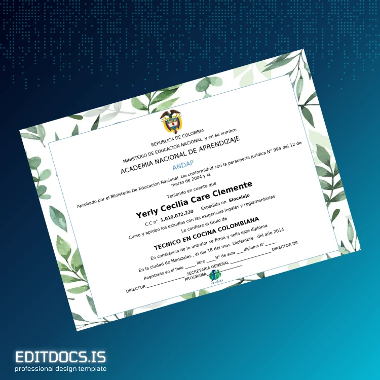 Easily edit the Colombia Academia Nacional de Aprendizaje Técnico en Cocina Colombiana Template (Word & PDF) to quickly customize your diploma certificate.