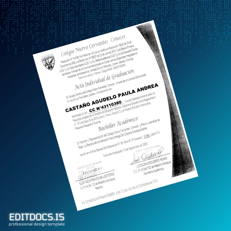 Easily edit and customize your Colombia Colegio Nuevo Cervantes High School Diploma Template (Word & PDF). Quick, professional replacement diploma design.