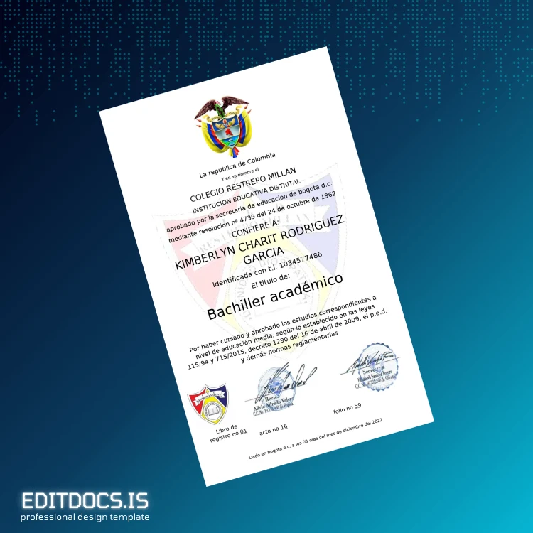 Experience unbeatable convenience with the Colombia Colegio Restrepo Millán High School Diploma Template (Word & PDF), a versatile digital diploma download designed for quick and professional customization. This replacement diploma template is perfect for individuals seeking a seamless way to generate a replica of their original high school diploma with ease and accuracy.