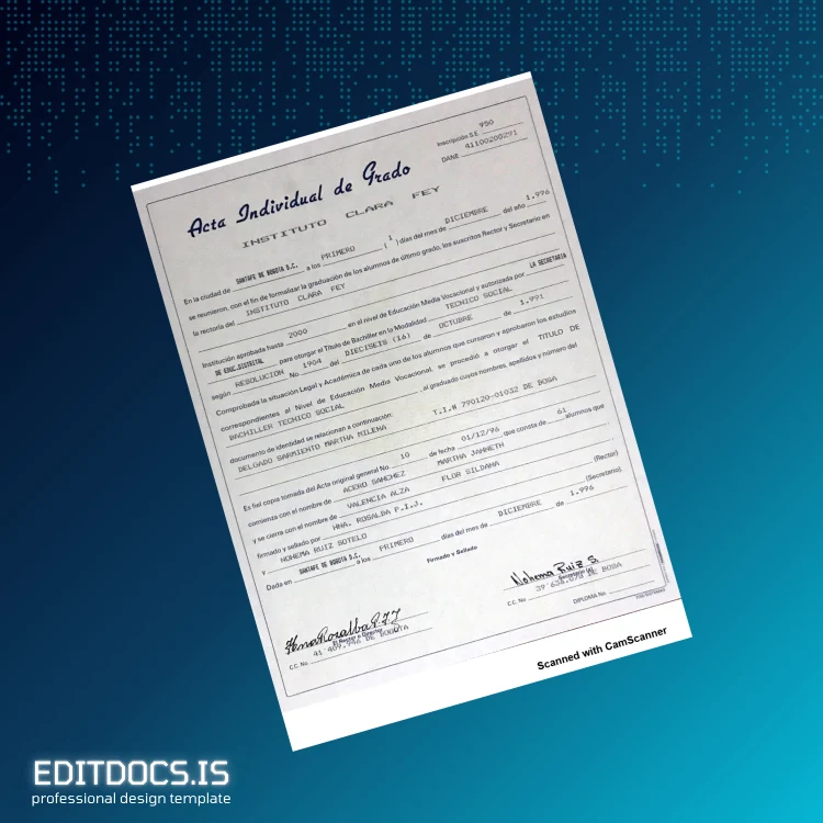 This editable diploma template provides a professional, easy-to-use design for recreating the Colombia El Instituto Clara Fey Technical Bachelor Certificate in both Word and PDF formats. Ideal for quick replacement or backup purposes, this digital diploma download lets you customize every detail conveniently from your computer. Whether you need a blank diploma form or a novel diploma design, this template offers a high-resolution and fully editable solution, perfect for professionals and institutions alike.