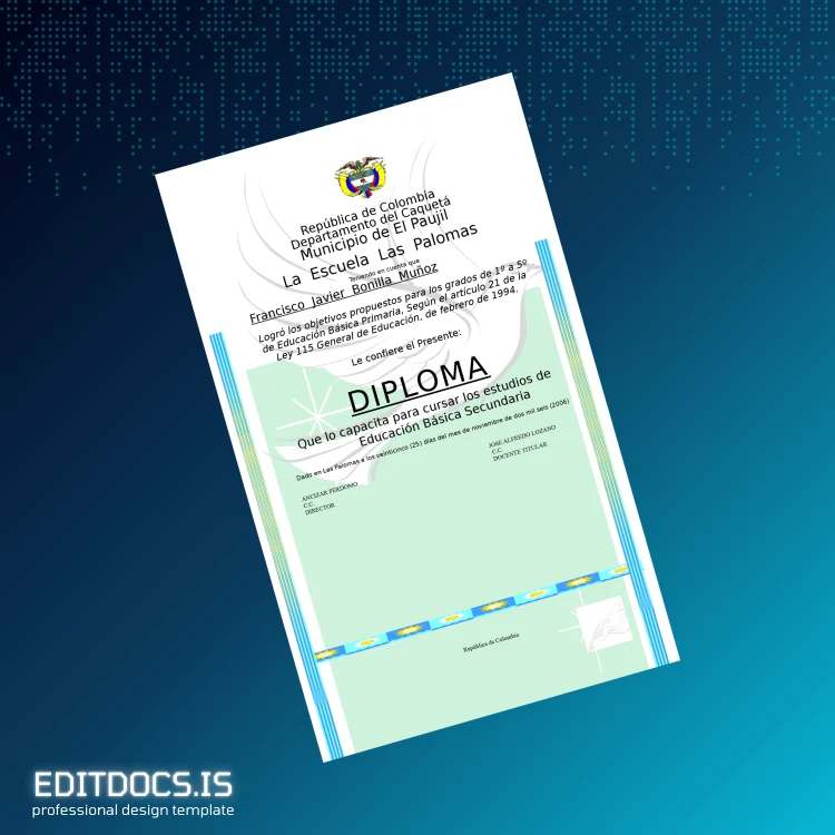 Effortlessly restore or customize your academic credentials with the Colombia Escuela Las Palomas Primary School Diploma Template, available in versatile Word and PDF formats. This editable diploma template is designed for individuals seeking a professional yet easy-to-modify replacement or backup copy of their original certificate. Whether you lost your diploma or need a fresh, printable document, this thoughtfully crafted template ensures quick and quality results.