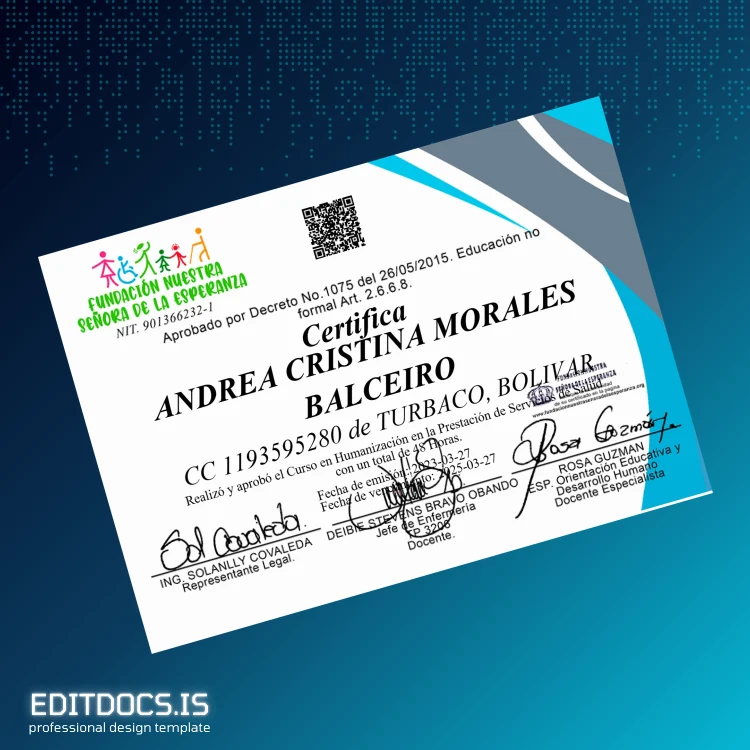This editable diploma template is designed to help professionals quickly generate a polished and authentic-looking Colombia Fundación Nuestra Señora de la Esperanza Course Certificate in Humanization. Perfect for those who require an instant replacement diploma or a professional backup, this customizable degree template offers ease and precision in every detail. Whether you lost your original, need a renewal, or want a novelty diploma design, this digital diploma download ensures seamless editing and professional results.