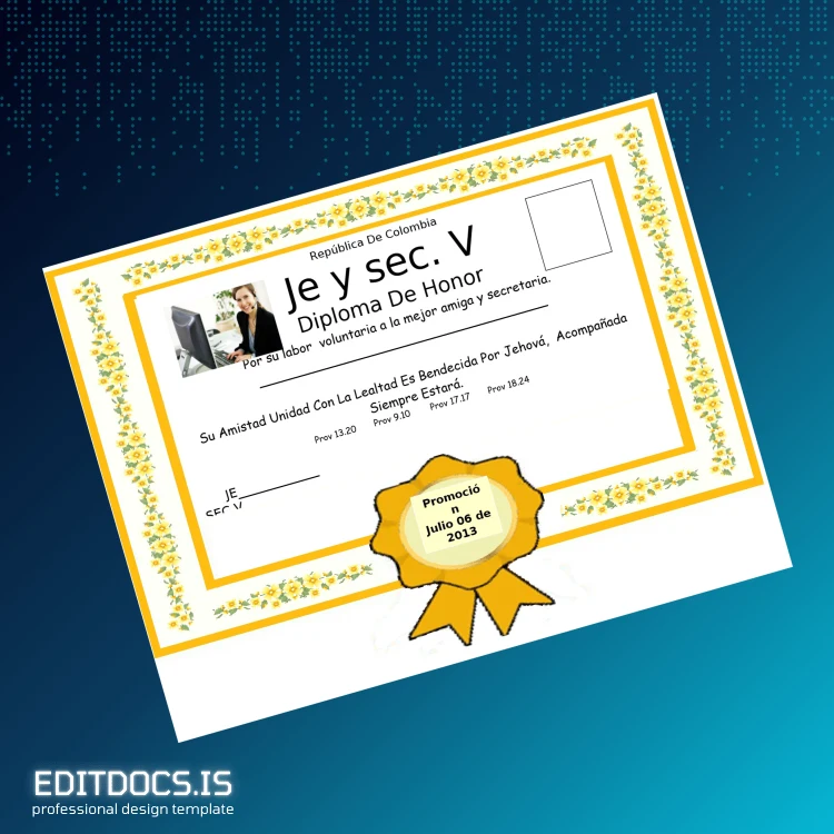Easily edit the Colombia Je y sec. V Honor Diploma Template (Word & PDF) to quickly customize text, dates, and layout in minutes.