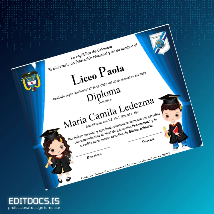 Easily edit the Colombia Liceo Paola Preschool Education Diploma Template (Word & PDF) to quickly customize text and layout for professional replacement diplomas.