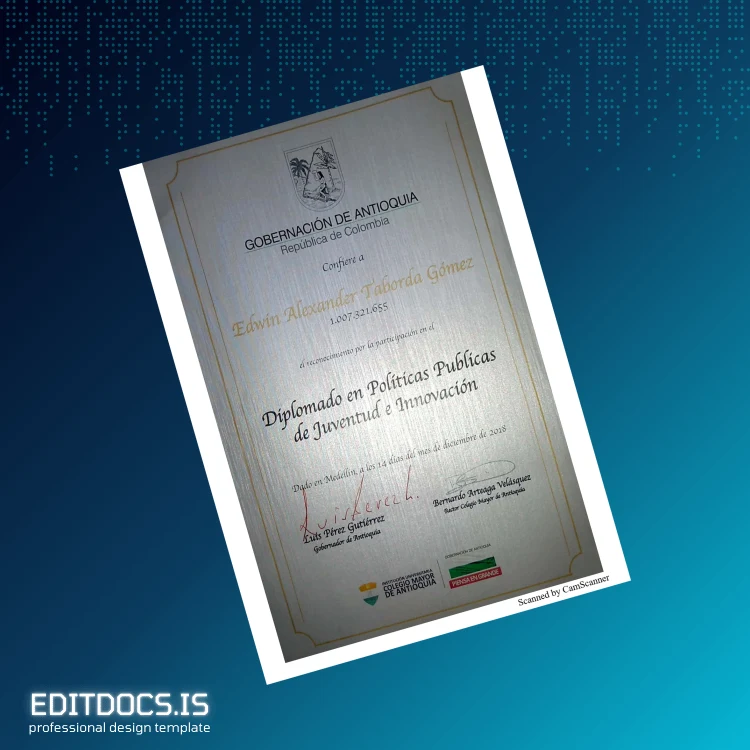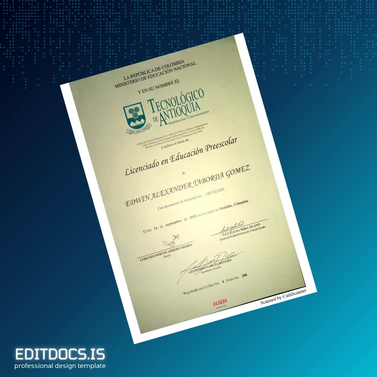 This editable diploma certificate template allows you to quickly and easily recreate your official Bachelor of Education in Preschool Education diploma from Colombia Tecnológico de Antioquia. Designed for educators and administrators needing a professional and editable document, this template comes in Word and PDF formats for maximum convenience. Whether you need a replacement diploma or a backup copy, this customizable degree template simplifies the process.