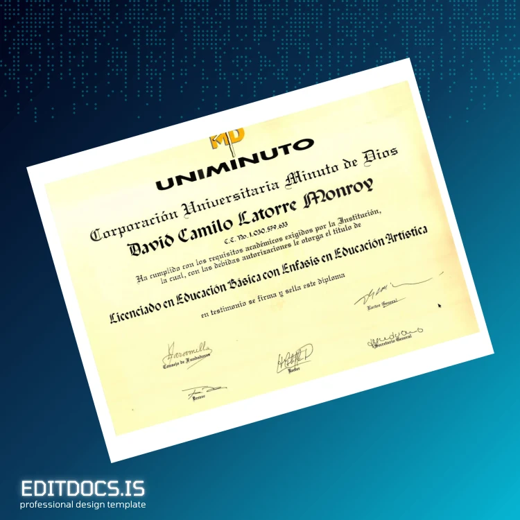 Discover an easy and professional way to produce your customizable diploma document using our Colombia Uniminuto Bachelor of Education with Emphasis in Artistic Education Template (Word & PDF). This digital diploma download is crafted to help educators and students swiftly create official-looking degrees with a clear, editable format perfect for replacement or personal archiving.
