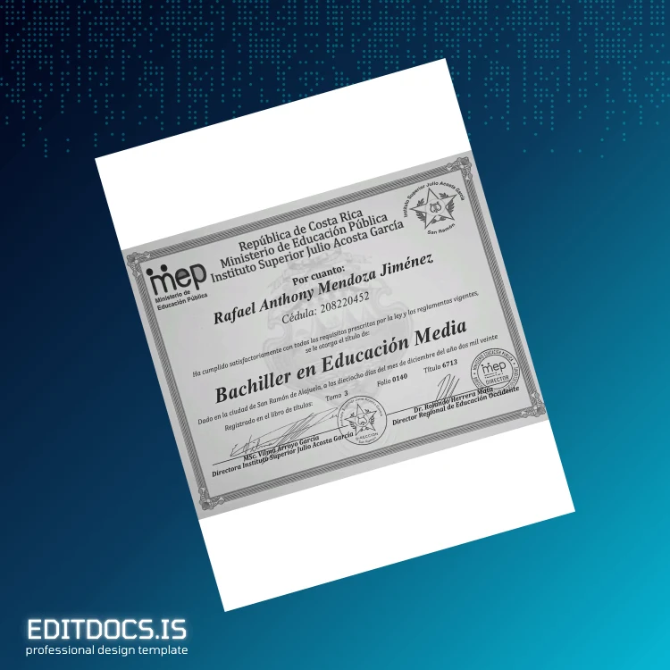 Easily edit the Costa Rica Instituto Superior Julio Acosta García High School Diploma Template (Word & PDF). Fast, simple customization of all text and fields.