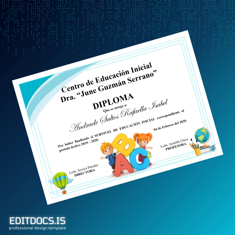 Unlock a seamless way to reproduce or replace your credential with this editable diploma template, tailored specifically for the Ecuador Centro de Educación Inicial _June Guzmán Serrano_. This digital download combines versatility and professionalism, available in both Word and PDF formats, ideal for educators, administrators, and individuals seeking a clean and customizable replacement diploma that reflects original standards.