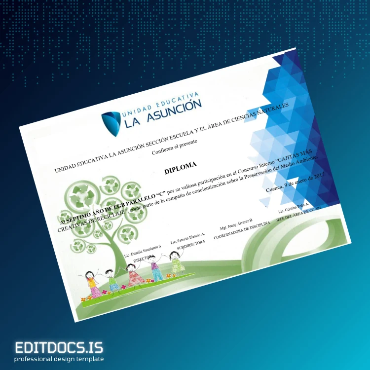 Easily edit Ecuador Unidad Educativa La Asunción Diploma for Participation in Recycling Contest EGB 7C Template (Word & PDF) for fast customization.