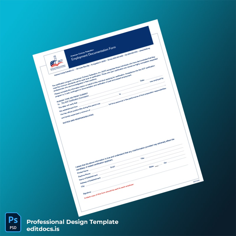 Editable American Culinary Federation Employment Verification Letter Word and PDF Template for quick, easy, professional employment verification documents.