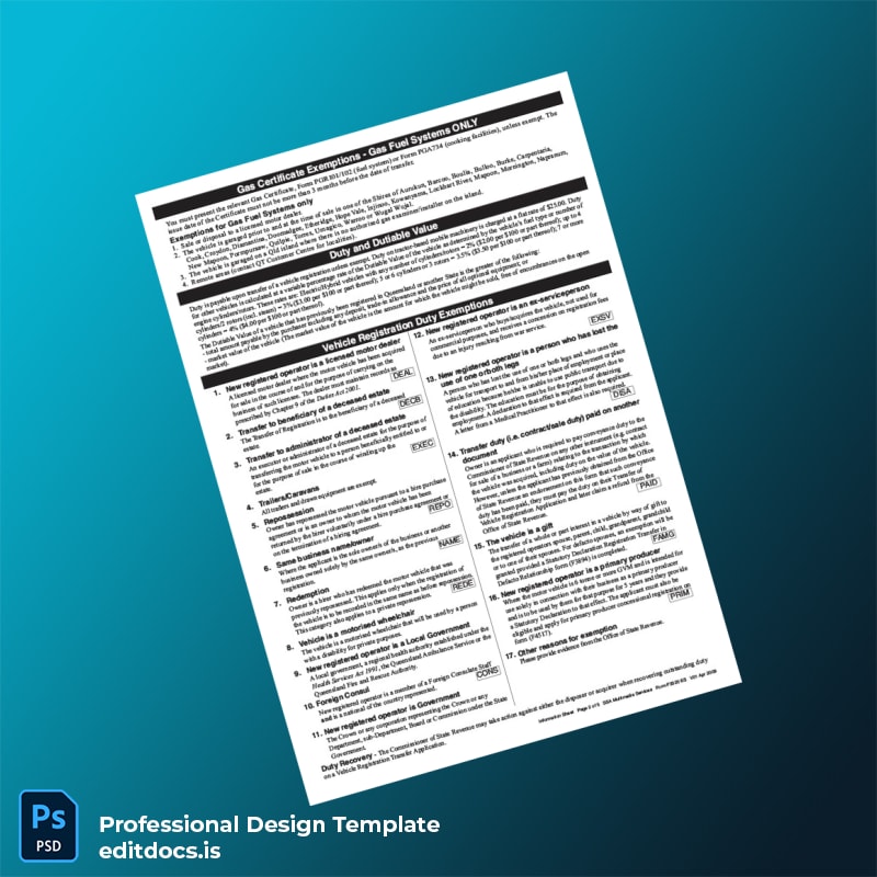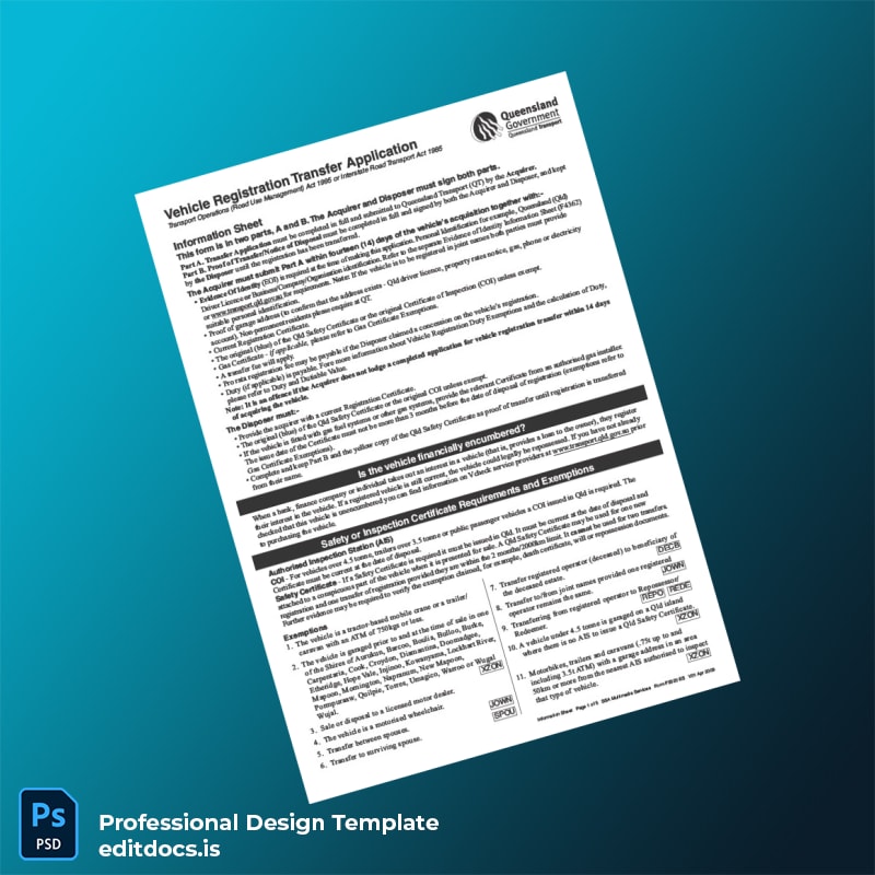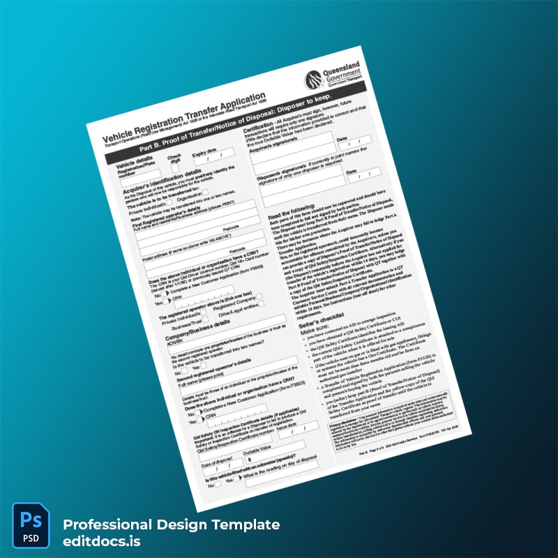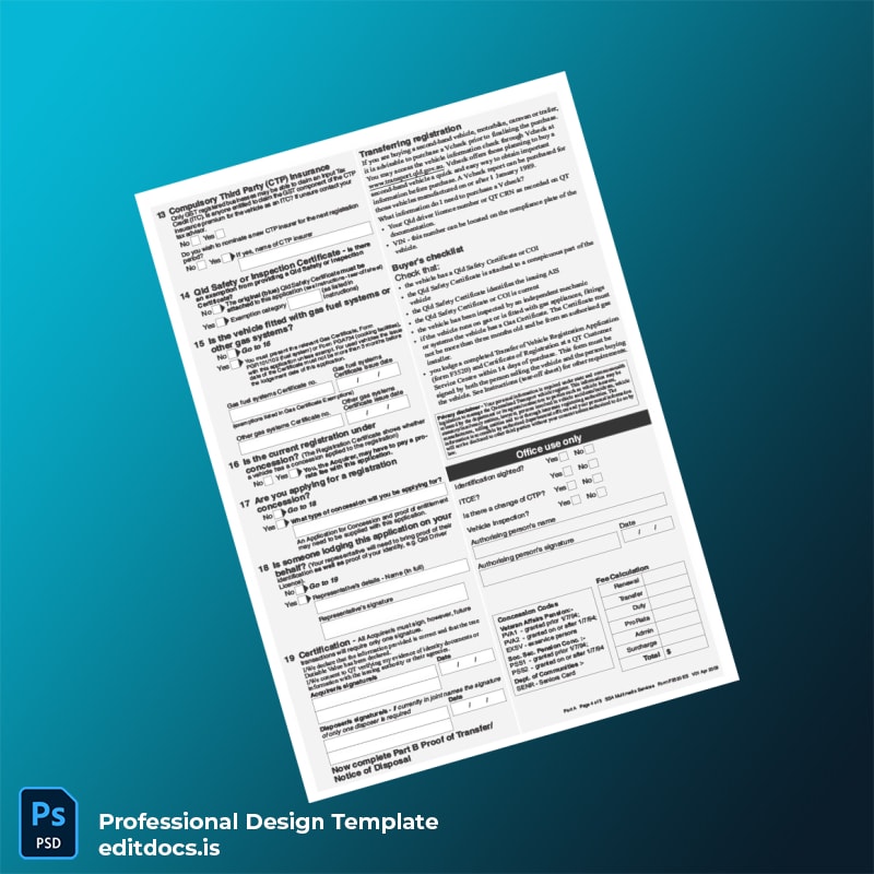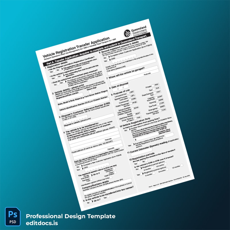 Streamline your vehicle registration transfer process with our Australia Queensland Vehicle Registration Transfer Application Template, available in convenient Word and PDF formats. Designed for professionals and businesses that require quick, accurate, and editable registration forms, this template offers unmatched ease of use and customization, ensuring compliance with local regulations and efficient documentation.