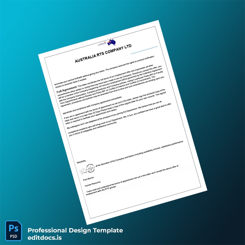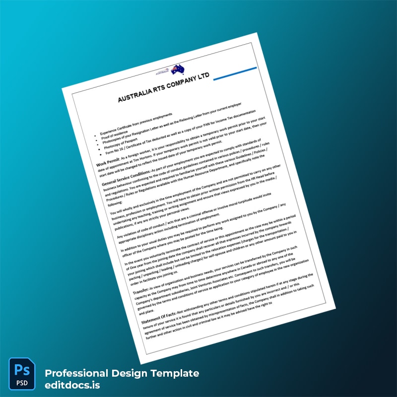Start improving your employment verification process today with an editable Australia RTS Company Ltd Employment verification letter Word and PDF template designed to meet your high standards and demanding workflow. Take control of your employment verification documents and enjoy the simplicity of quick, professional output.