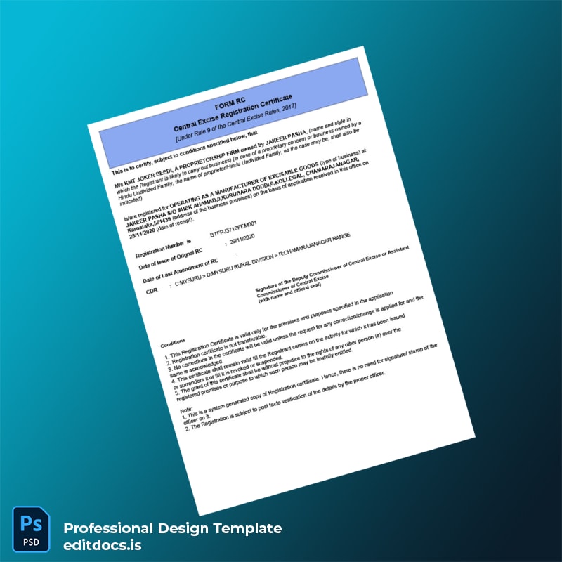Facing challenges with managing your official excise registration documents? Our India Central Excise Registration Certificate Template, available in Word and PDF formats, offers a seamless solution tailored for professionals seeking quick and precise modifications. This editable registration certificate simplifies updating crucial business information without the typical hassle.