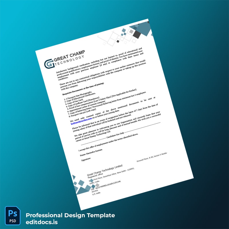 The India Great Champ Technology Ltd Employment Offer Letter Template (Word & PDF) is your essential resource for creating clear, official employment documents swiftly. Designed for HR professionals, recruiters, and business managers worldwide, this easy-to-edit template meets every need for accurate employment verification and job confirmation.