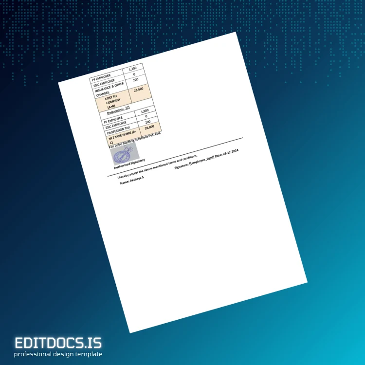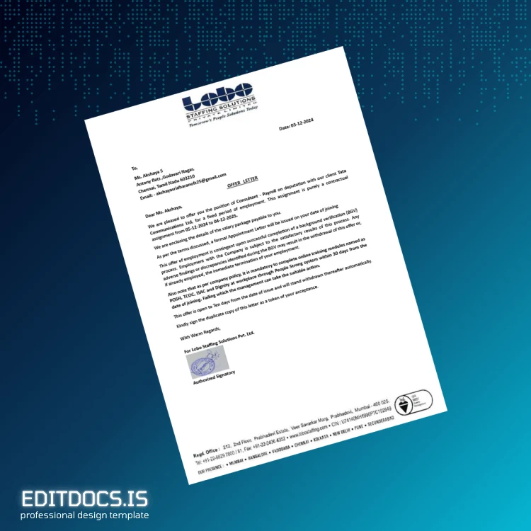 Editable India Lobo Staffing Solutions Pvt Ltd Employment Verification Letter Word and PDF Template. Easy to edit for quick, professional employment verification letters.