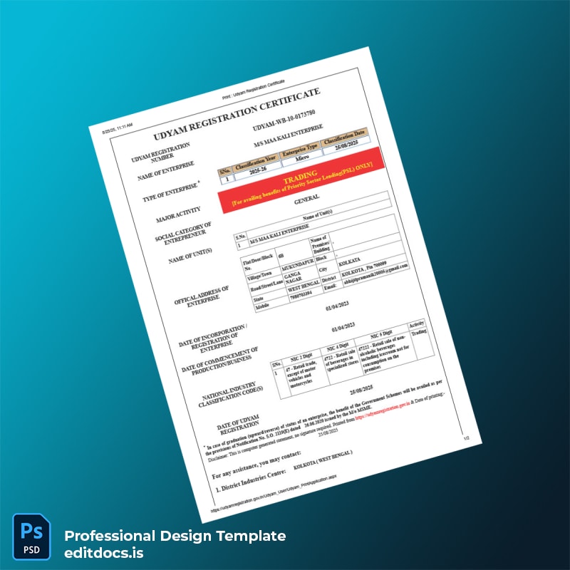 Streamline Your Business Registration Updates with the India MSME-DIFO Udyam Registration Certificate Template