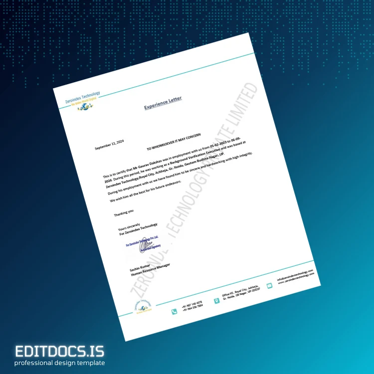 The Editable India Zeroinedex Technology Employment Verification Letter Template (Word & PDF) equips professionals with a straightforward, adaptable resource to quickly confirm employment status. Whether you need to provide proof of employment for immigration, financial, or professional purposes, this template is designed to simplify the process, ensuring accuracy and professionalism in every document you produce.