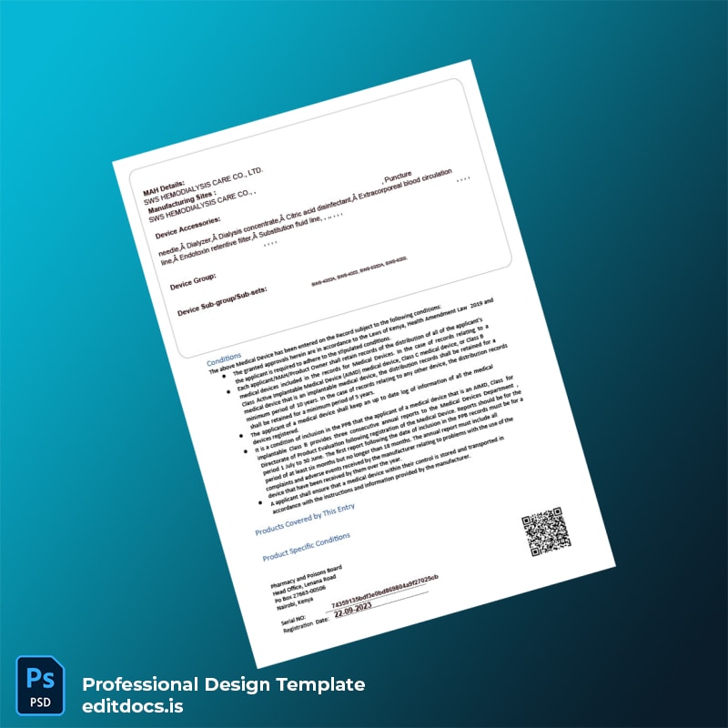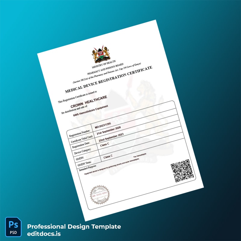 Ensure your medical device registration is seamless and professional with our Kenya Pharmacy and Poisons Board Medical Device Registration Certificate Template, available in both Word and PDF formats. Designed specifically for medical manufacturers, distributors, and regulatory professionals, this template offers a reliable, editable registration certificate solution that meets all official requirements while allowing for quick customization.