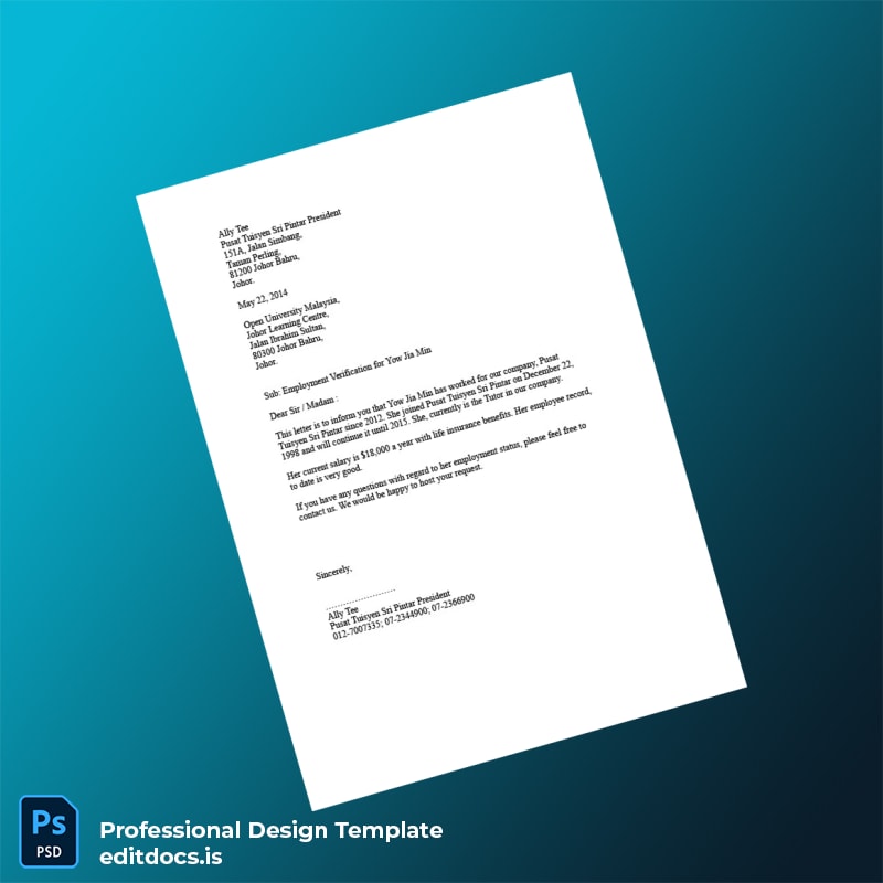 Don’t let employment verification become a bottleneck in your administrative workflow. Download your editable Malaysia Pusat Tuisyen Sri Pintar Employment Verification Letter Template today and experience the ease of producing professional, compliant employment letters in minutes. Empower your HR department with efficient, polished documents that instill confidence in all recipients.